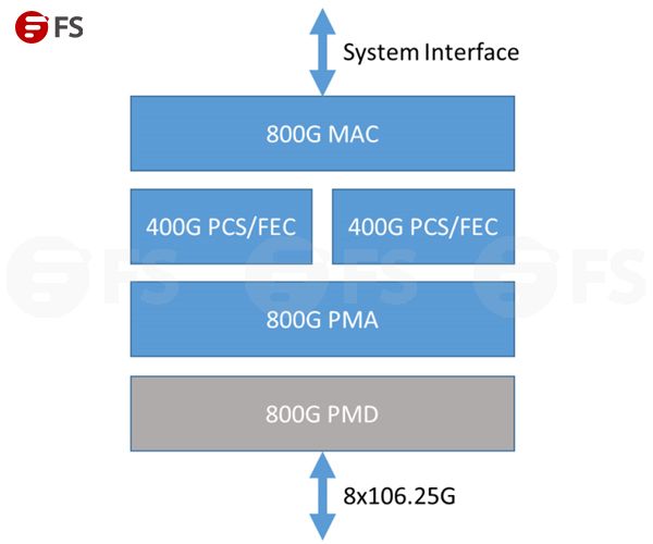 目前,IEEE(電氣和電子工程師協會)還沒有制定800G以太網的標準,但25G以太網聯盟(現更名為以太網技術聯盟(ETC))已經在2020年4月制定了用于800G以太網的800GBASE-R規范。ETC宣稱該規范盡可能地利用400GbE的標準來建立一個800GbE MAC(媒體訪問控制)和PCS(物理編碼子層)規范,并降低用戶可以在以太網端口上實現多速率的成本。800GBASE-R規范采用的仍然是400G以太網中現有的106.25G通道,目的是將PCS的總通道數增加一倍(也就是從4條增加到8條)。從字面上看像是一個非常簡單的概念變化,但是要想以這種方式將新增的通道綁在一起,是需要大量的人力、物力和財力的。